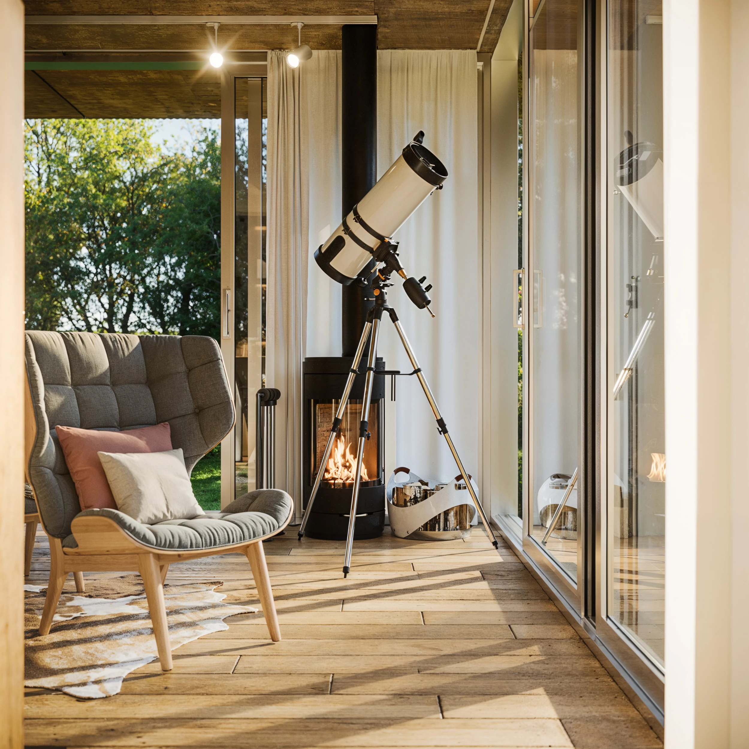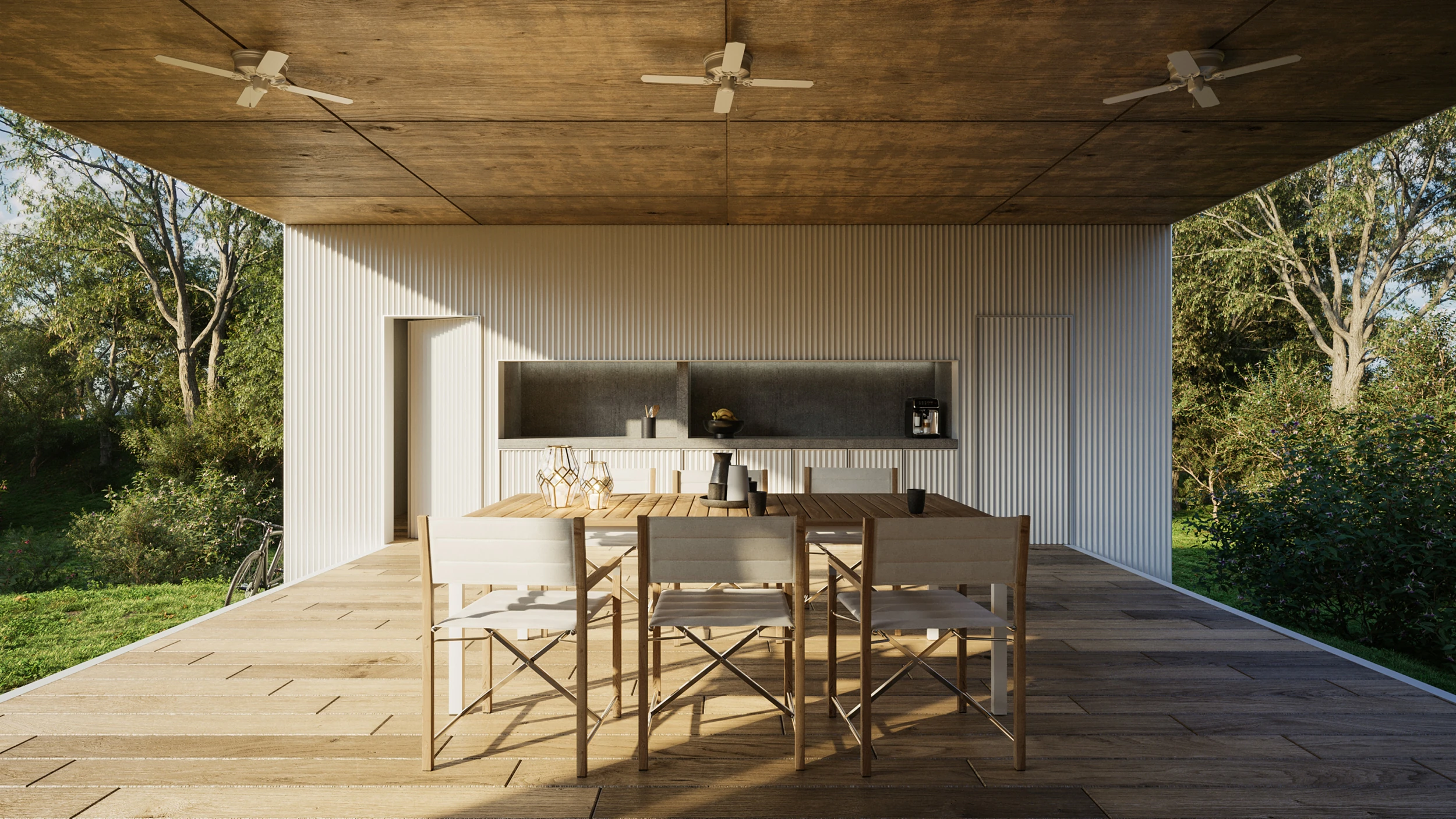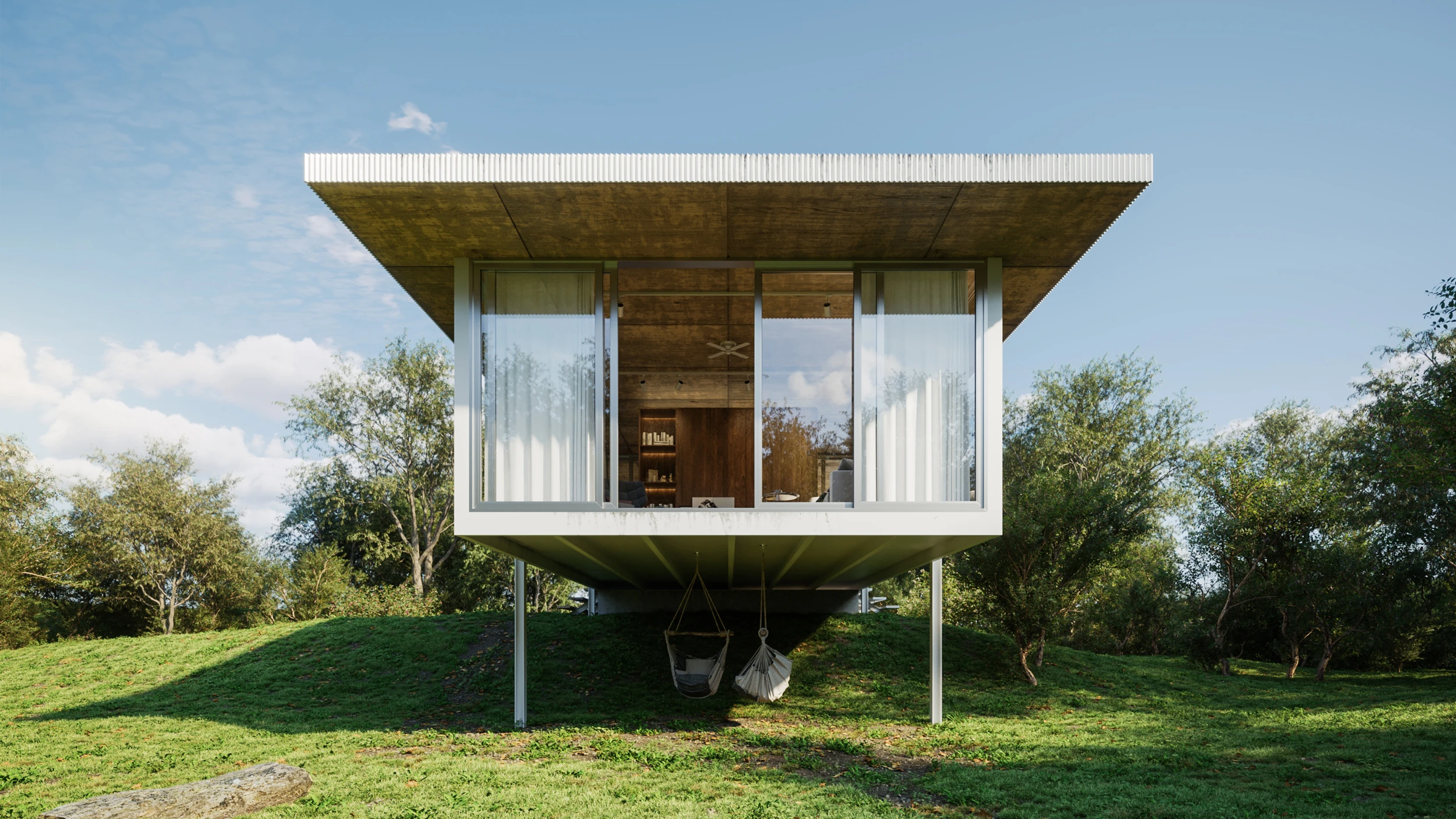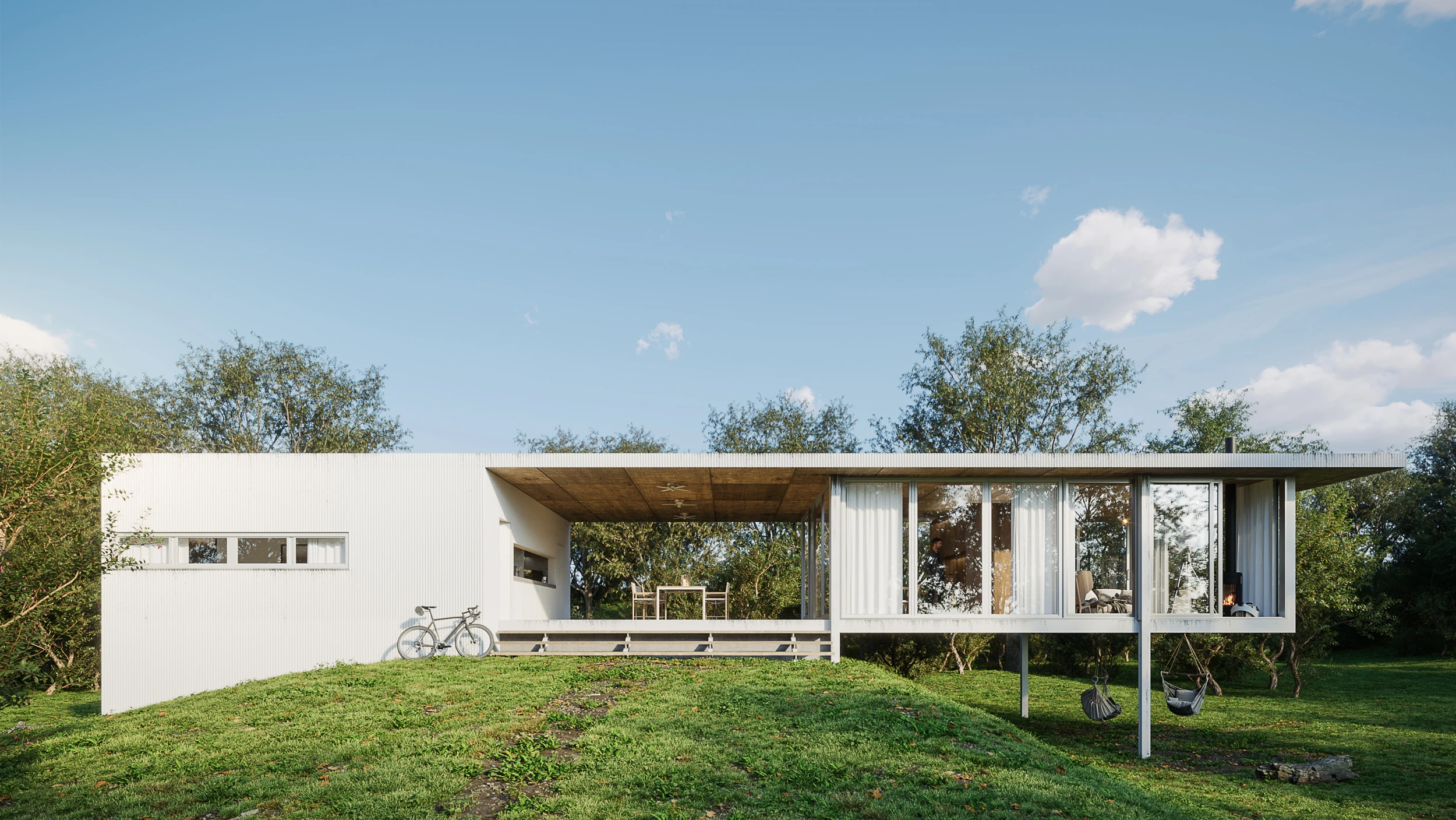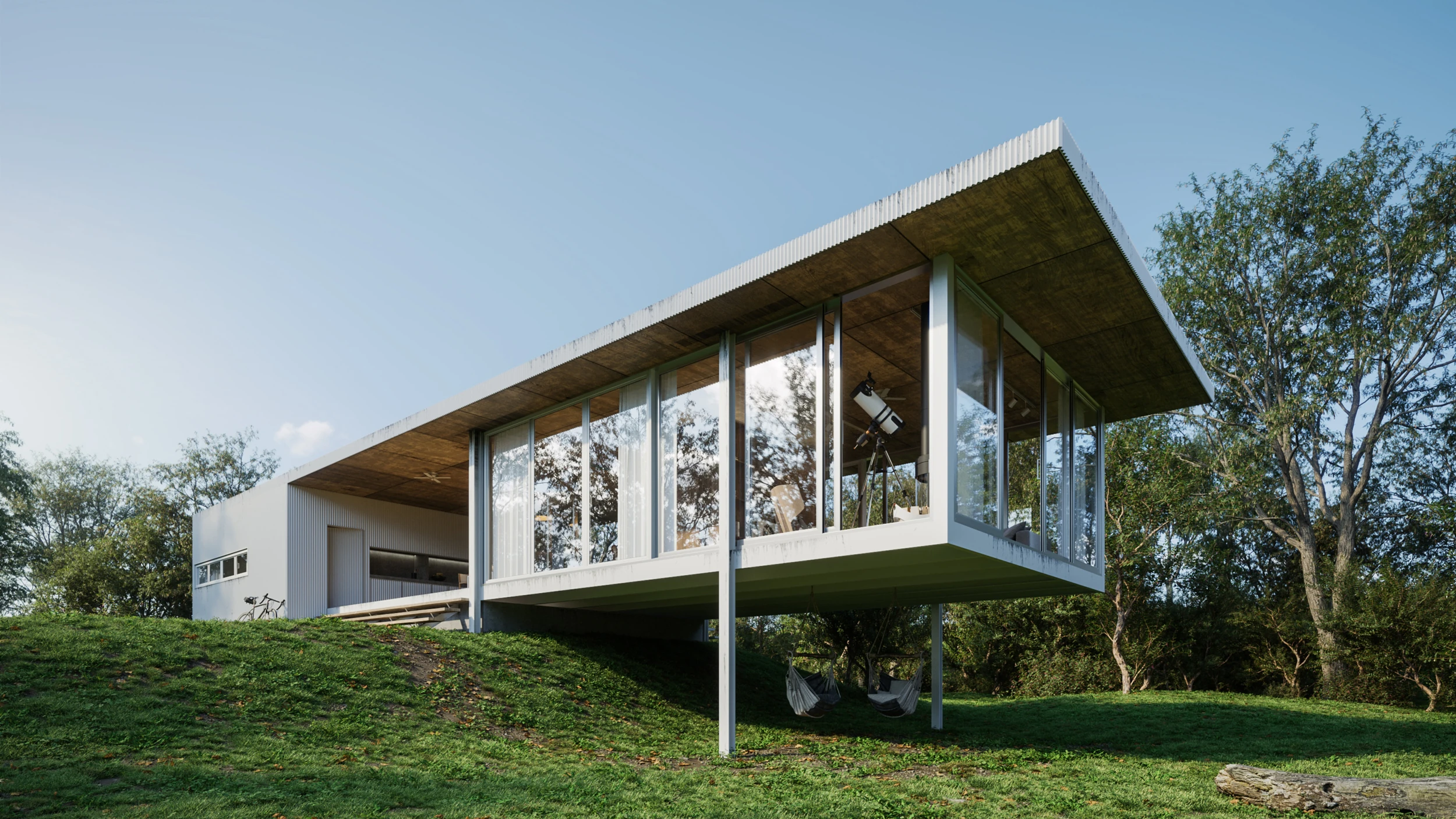Vyvýšená hmota domu s bílými panely a dřevěným obkladem působí v zeleni lehce, téměř jako by se vznášela. Klíčovým prvkem renderů je transparentnost – velké prosklené stěny, které vizuálně ruší bariéru mezi interiérem a exteriérem. Důraz na přirozené denní světlo a textury materiálů vytváří v každém záběru atmosféru absolutní svobody a klidu.