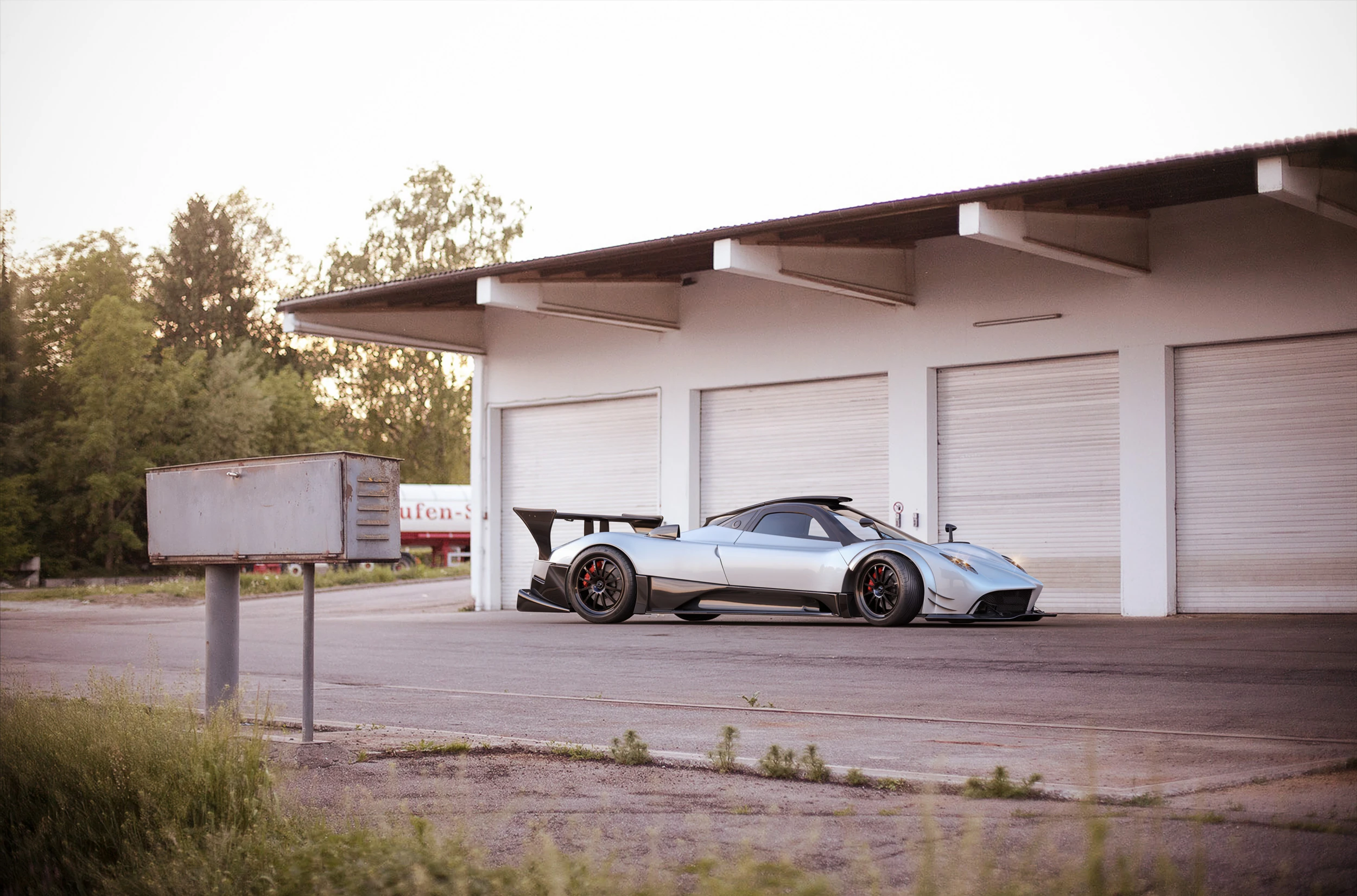 A high-end automotive rendering showcasing the legendary Pagani Zonda R, captured in a raw industrial environment that emphasizes its racing DNA. The composition highlights the car’s sculpted carbon body, aerodynamic details, and aggressive stance. Soft evening light enhances the metallic reflections and contrasts the precision engineering of the Zonda with the minimal, worn surroundings — celebrating the fusion of art, performance, and craftsmanship.